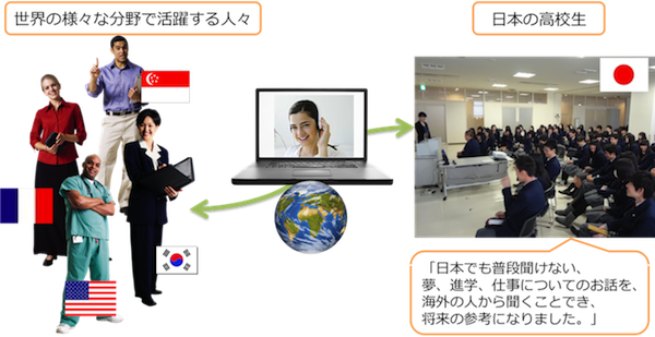 インターネット電話を活用して、日本の教室と海外をつなぎ、主にインタビュー形式で学生は海外ゲストとの交流を行います。世界にはどんな生き方をしている人がいるのかを知り、多様な価値観に触れることで、外の世界への興味を喚起します。