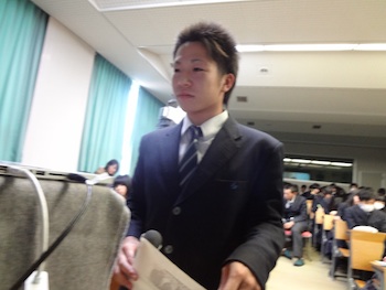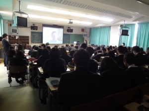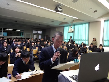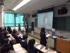 グローバルに活躍する国際人から直接学ぶことがテーマの今回は、ヨーロッパ、アジア、中東でのビジネス経験を持つ、国際ビジネスパーソンのクリスさんを講師としてお招きました。現在はプロジェクトで滞在中のサウジアラビアからインターネットを通して参加です。サウジアラビアの首都の街をスクリーンを通してみせてもらい、その初めて見る世界にみんなの驚きと感動の声があがりました。(写真右は代表挨拶の学生)